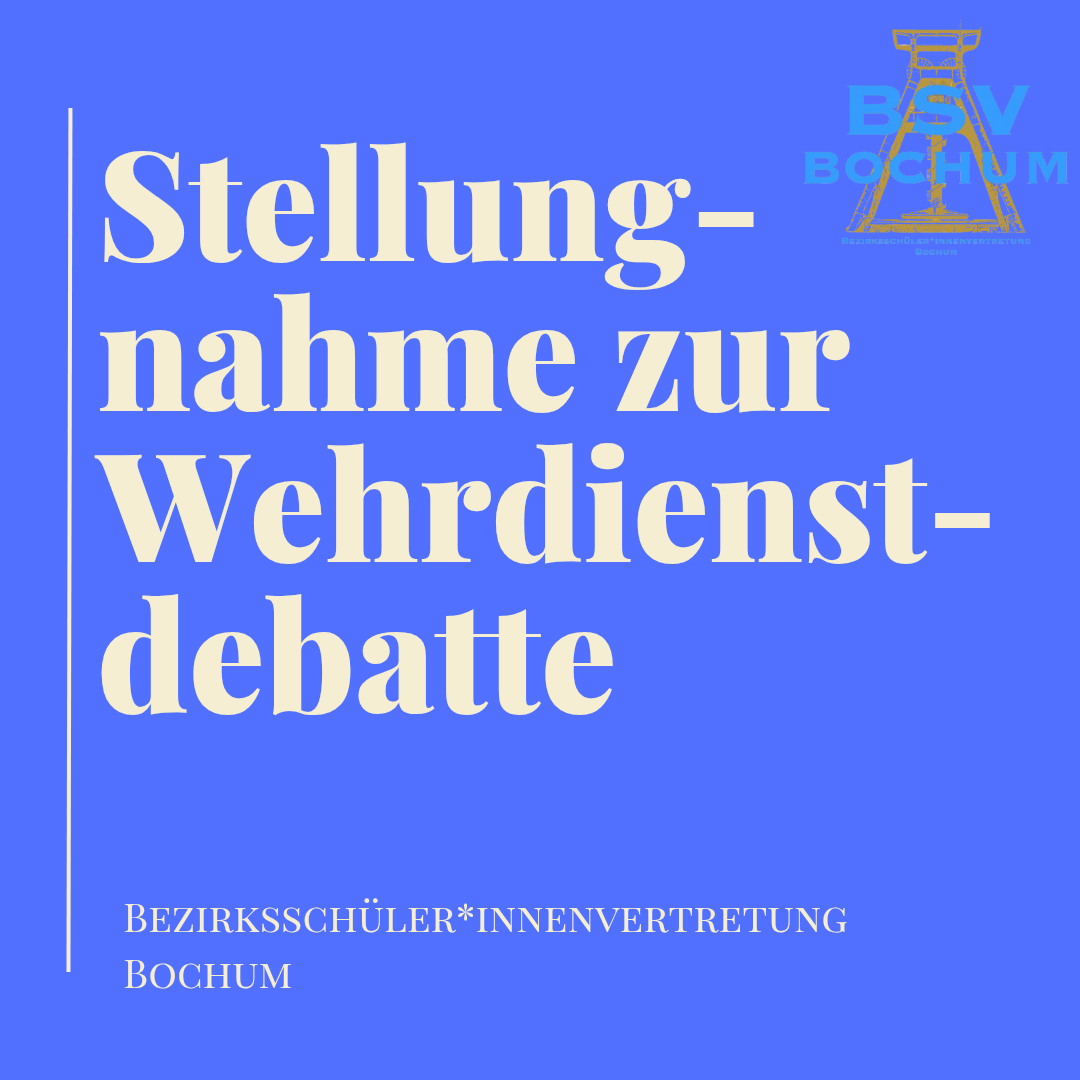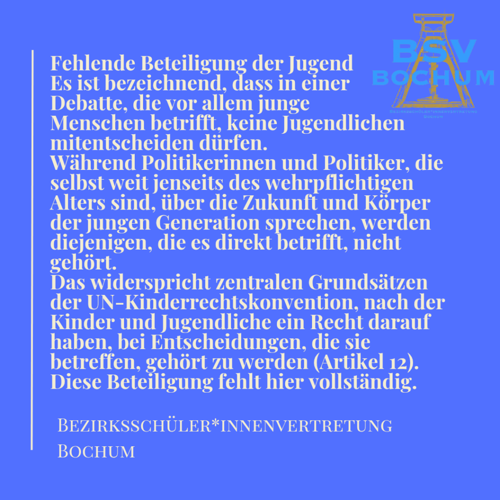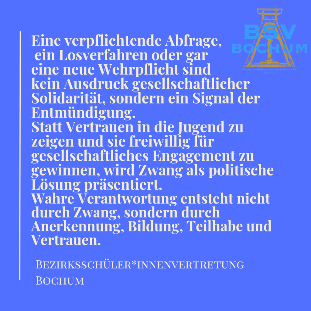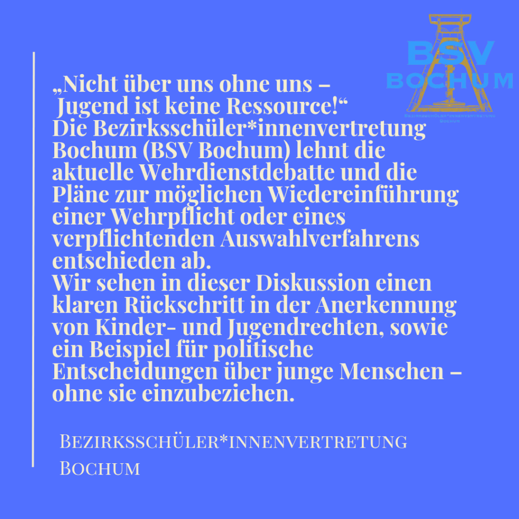 Die Bezirksschüler*innenvertretung Bochum (BSV Bochum) lehnt die aktuelle Wehrdienstdebatte und die Pläne zur möglichen Wiedereinführung einer Wehrpflicht oder eines verpflichtenden Auswahlverfahrens entschieden ab. Wir sehen in dieser Diskussion einen klaren Rückschritt in der Anerkennung von Kinder- und Jugendrechten, sowie ein Beispiel für politische Entscheidungen über junge Menschen – ohne sie einzubeziehen.