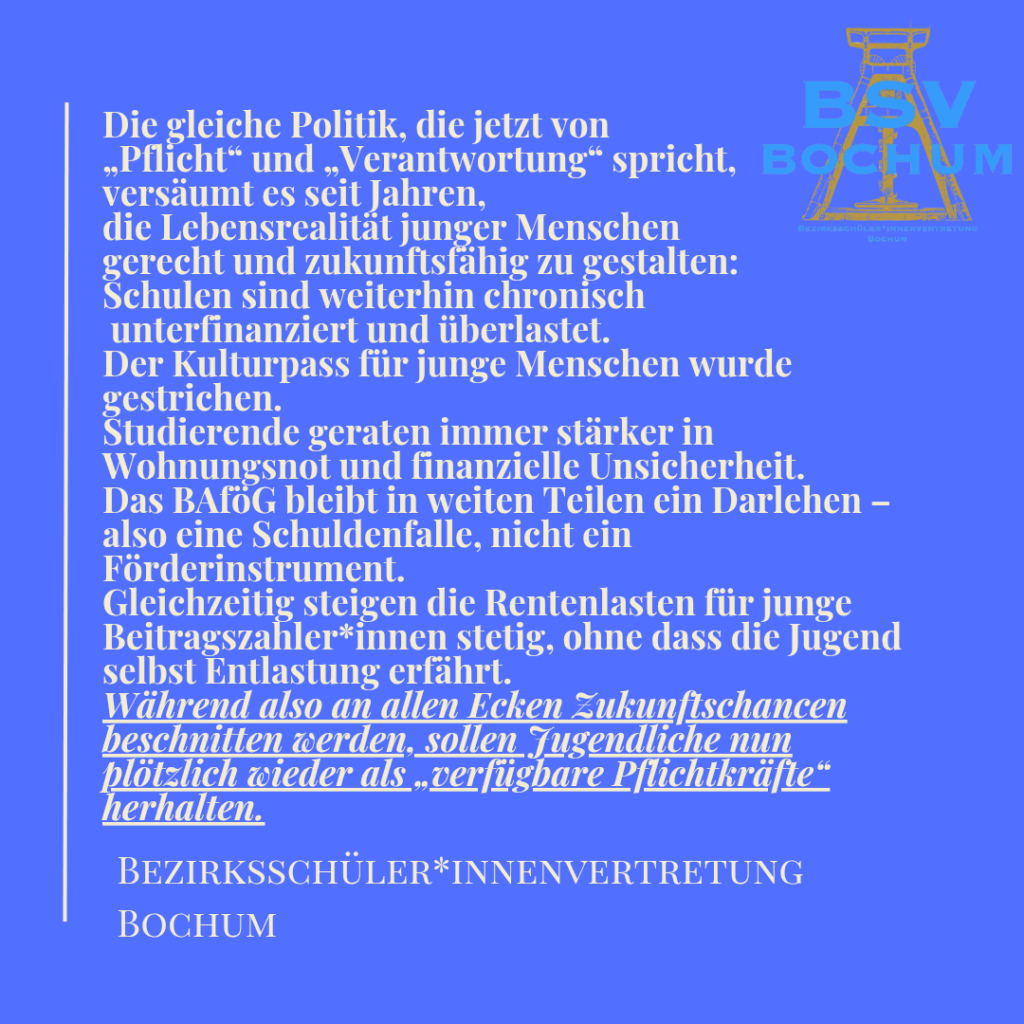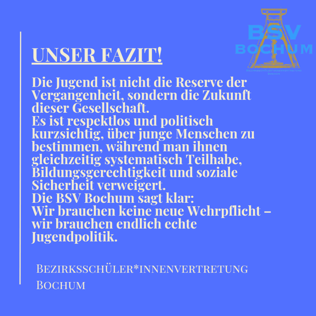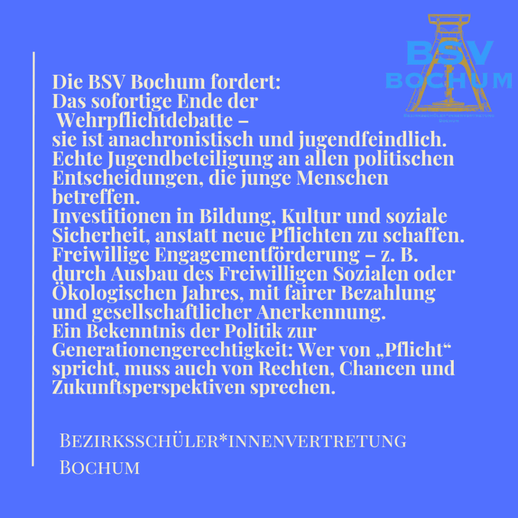 Die BSV Bochum fordert: Das sofortige Ende der Wehrpflichtdebatte, sie ist anachronistisch und jugendfeindlich. Echte Jugendbeteiligung an allen politischen Entscheidungen, die junge Menschen betreffen. Investitionen in Bildung, Kultur und soziale Sicherheit, anstatt neue Pflichten zu schaffen. Freiwillige Engagementförderung, z. B. durch Ausbau des Freiwilligen Sozialen oder Ökologischen Jahres, mit fairer Bezahlung und gesellschaftlicher Anerkennung. Ein Bekenntnis der Politik zur Generationengerechtigkeit: Wer von „Pflicht“ spricht, muss auch von Rechten, Chancen und Zukunftsperspektiven sprechen.