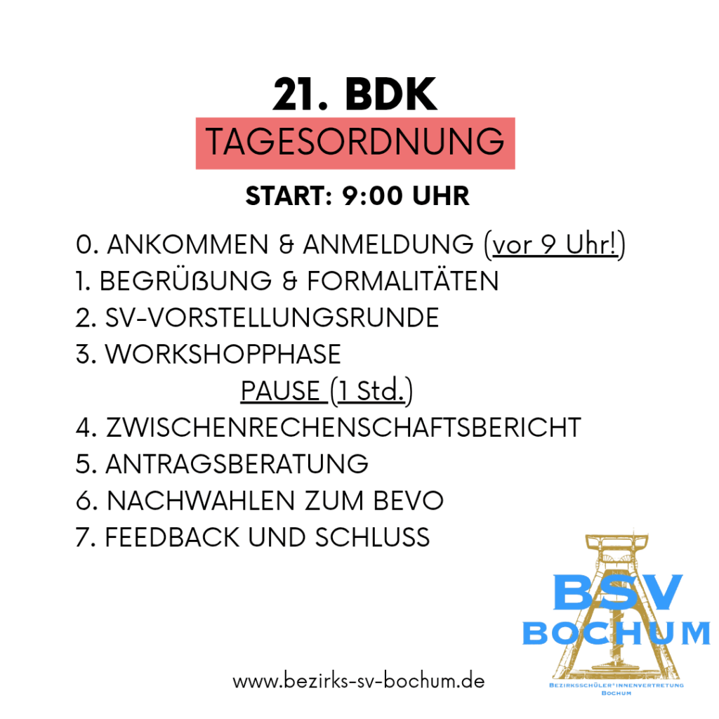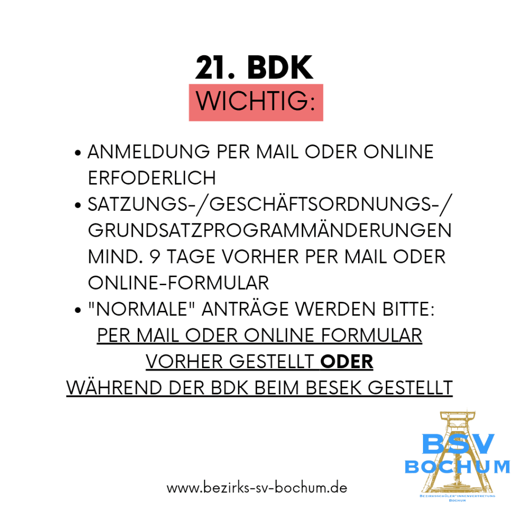 Die Bezirksschüler*innenvertretung (BSV) Bochum lädt alle Schüler*innenvertretungen der Bochumer Schulen herzlich zur 21. Bezirksdelegiertenkonferenz (BDK) ein!